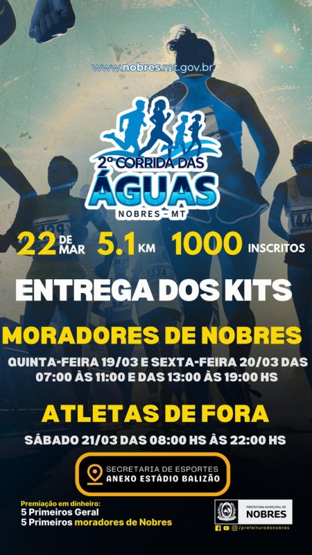 2ª CORRIDA DAS ÁGUAS é um evento realizado pela Secretaria Municipal de Esportes e Lazer de Nobres – MT, com finalidade incentivar hábitos saudáveis, promover qualidade de vida, fortalecer o esporte, valorizar as belezas naturais do município e incentivar ao turismo sustentável, além de unir saúde, natureza e responsabilidade ambiental em uma experiência num dos endereços mais belos de Mato Grosso.
