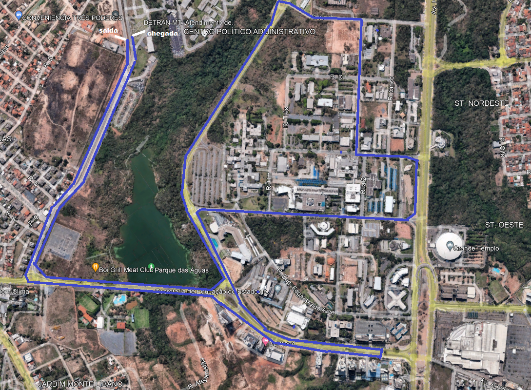 5.1 A competição terá percurso de aproximadamente 7 km com largada de PCD às 7:00 e Pelotão Geral (feminino e masculino) Às 07:10. A largada e chegada será dentro das dependências da sede do Detran-MT (Centro Político e Administrativo) em frente ao barracão de vistoria de veículos, a largada será nas ruas internas do Detran em direção ao trevo da Av. Paiaguás, conforme o mapa que abaixo se segue: