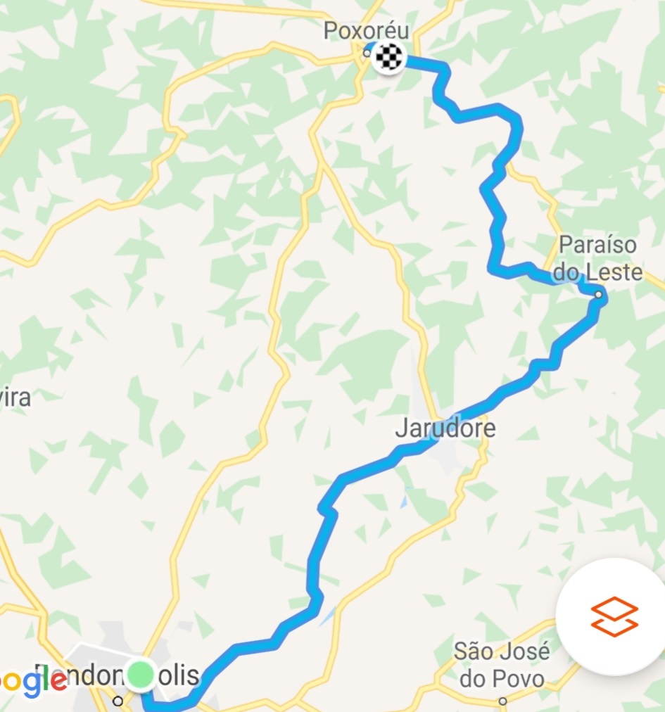 1.6) O percurso do passeio compreende o seguinte percurso: Na MT-130 frente ao parque de exposições de Rondonópolis, passando por Três Pontes, Jarudore, Paraiso do Leste, Aparecida do leste com final na Associação Atlética banco do Brasil (AABB) na cidade de Poxoréu-MT, com total de 130KM.