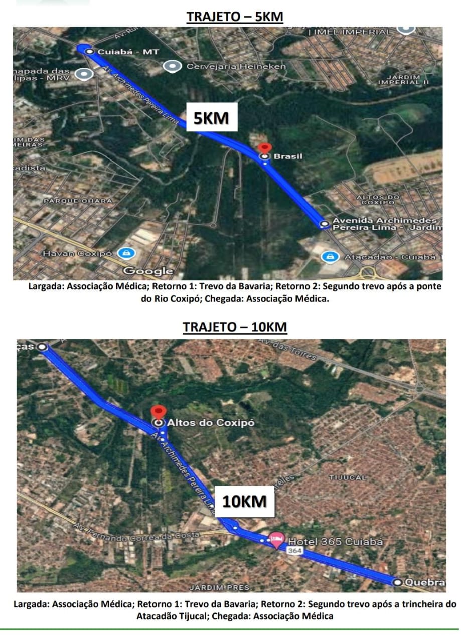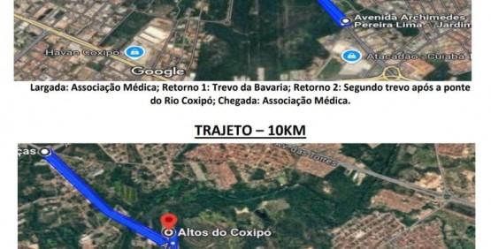 Artigo 1º. A 1ª CORRIDA DIA DO MÉDICO, é evento esportivo que vem proporcionar a prática de atividade física através da corrida de rua aos membros do Conselho Regional de Medicina de Mato Grosso-CRMMT, da Associação Médica de Mato Grosso-AMMT e do Sindicatos dos Médicos de Mato Grosso-SINDIMEDMT, também para seus familiares, e todos praticantes de corrida de Cuiabá e de todo estado de Mato Grosso; a corrida terá largada, chegada e maior parte do percurso na Estrada do Moinho (Avenida Arquimedes Pereira Lima)