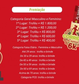 A premiação para categoria GERAL seguirá as normas da Confederação Brasileira de Atletismo (CBAt), considerando a ORDEM DE CHEGADA (TEMPO BRUTO) como critério para definir os vencedores, conforme escrito abaixo: