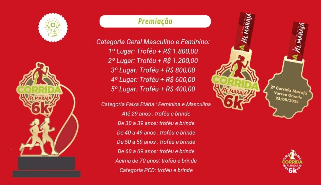 A corrida será realizada dia 25 de Agosto de 2024 com a largada e chegada em frente à Fábrica Refrigerantes Marajá em Várzea Grande, na av. Frei Coimbra N 1955 Jardim Ouro Branco, largada às 06h30, com distância de 6 km.