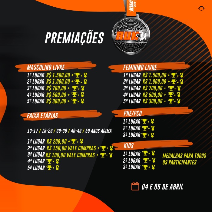 *Serão premiados no pódio com troféus de participação do 1º ao 3º lugar de cada faixa etária masculino e feminino, e medalha exclusiva para todos que concluírem a prova*.