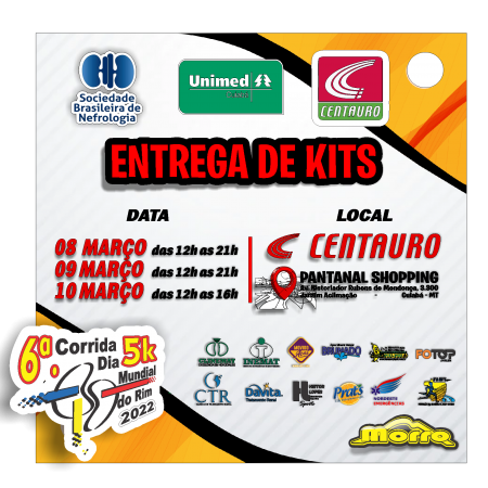 2.3. O KIT é uma cortesia da organização e será composto de: número de peito e chip eletrônico. Apesar de ter a opção de kit sem camisetas , a organização solicita a colaboração de todos os atletas, para que na data do evento, prefira trajar as cores do Dia mundial do Rim, AZUL, AMARELO ou VERMELHO.