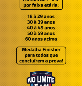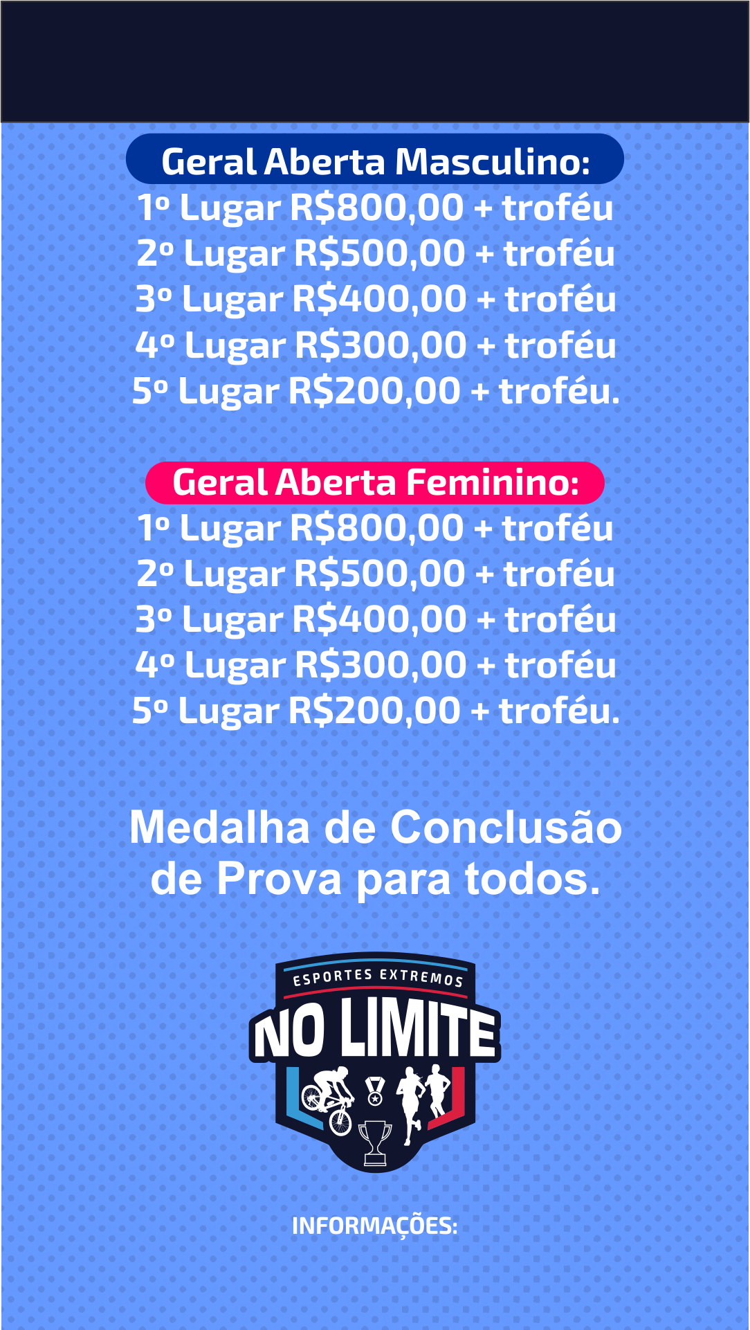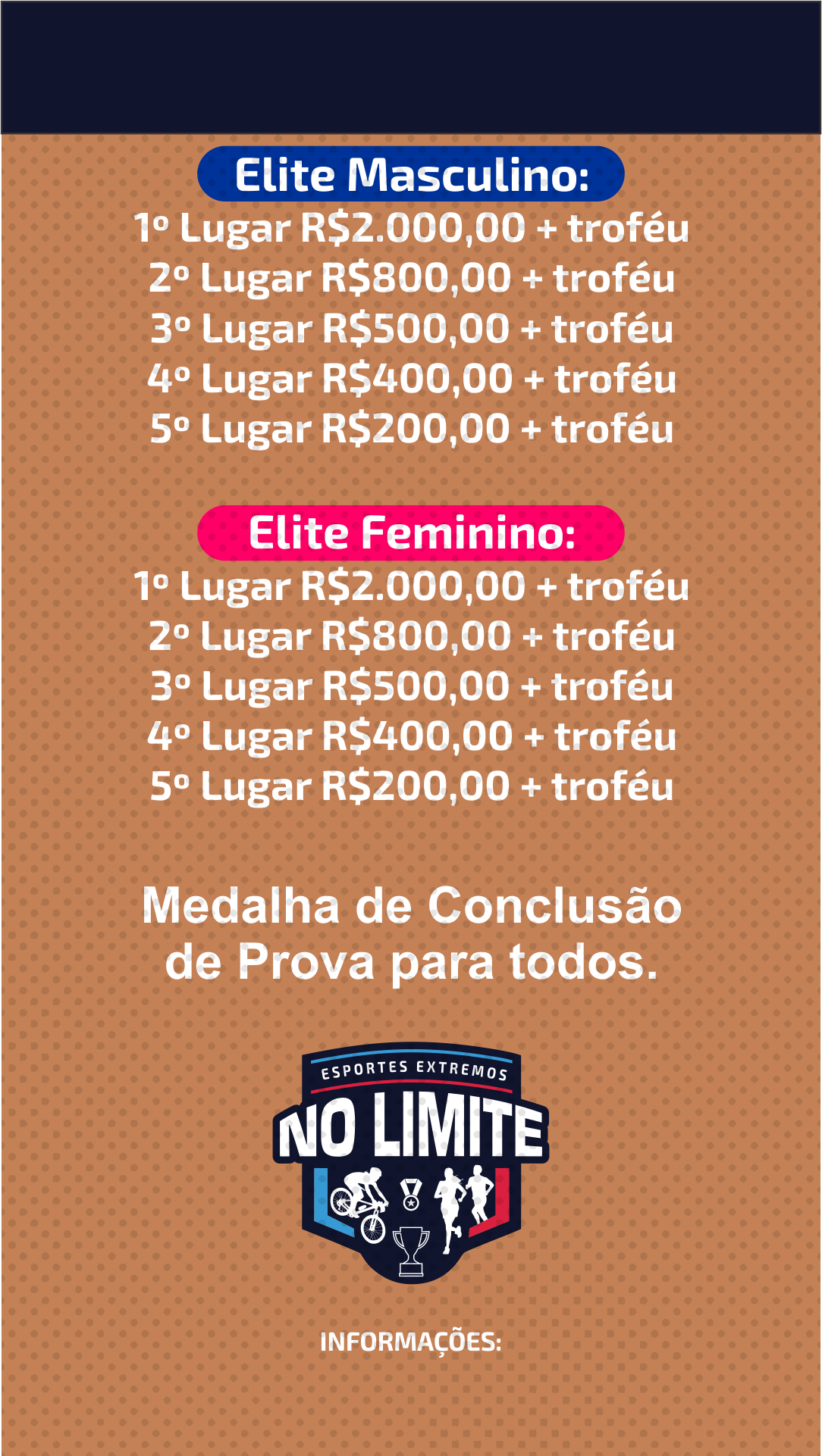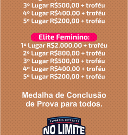B. Os atletas 1º, 2º e 3º de cada faixa etária, masculino e feminino, ganham TROFÉU. O primeiro e a primeira colocada de cada faixa etária recebem 30% de desconto para a qualquer outro evento da No Limite Esportes Extremos.