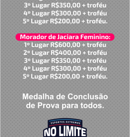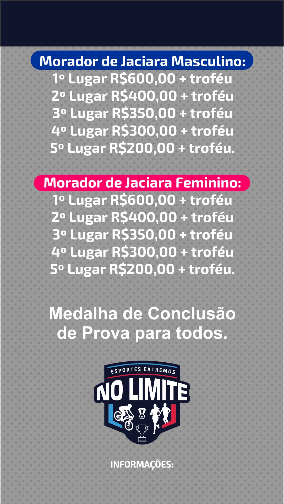 A. Os cinco primeiros atletas das categorias *ELITE, *GERAL E *MORADOR DE JACIARA masculino e feminino, recebem premiação em dinheiro e troféu.