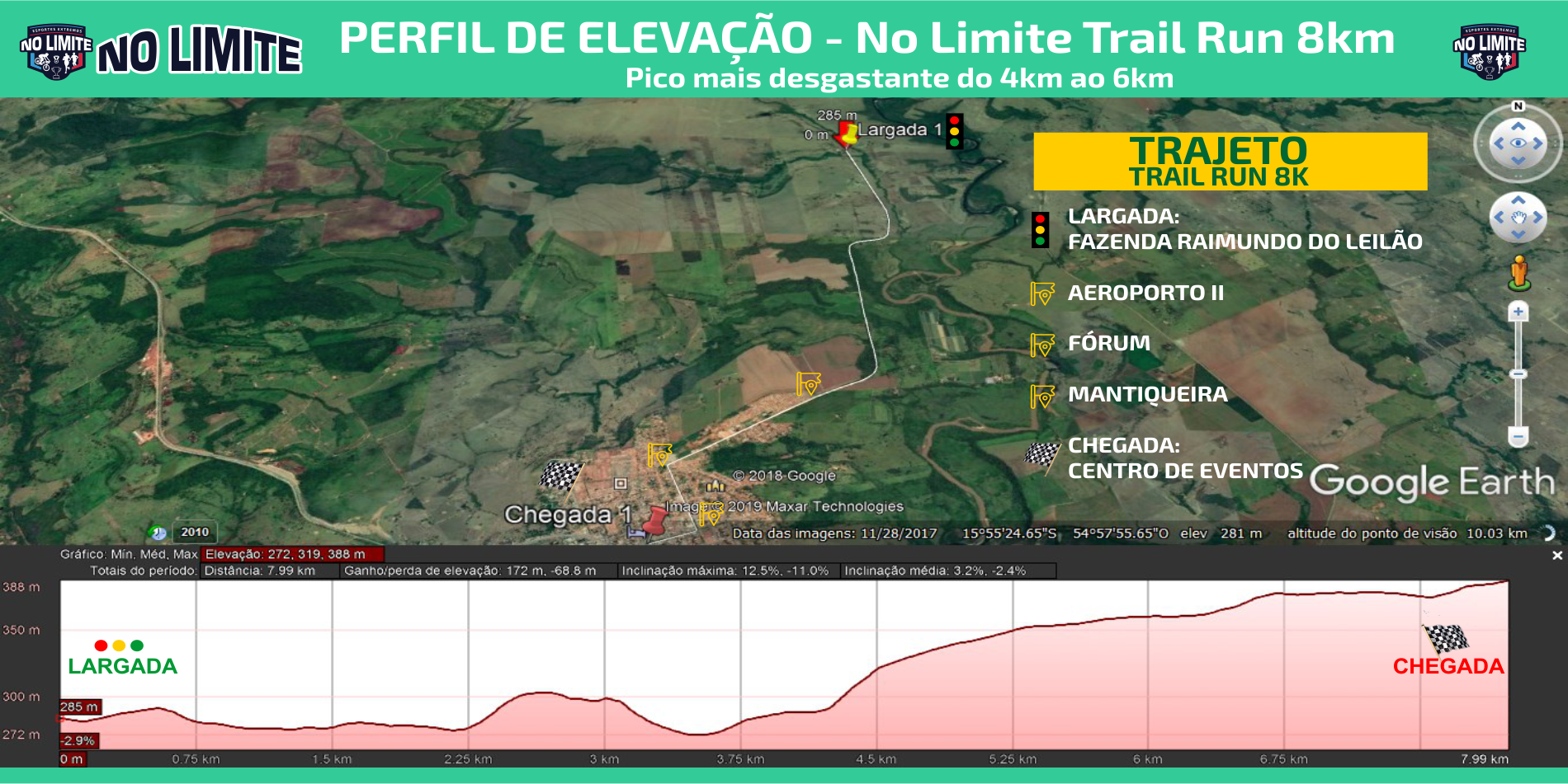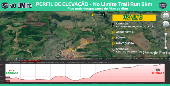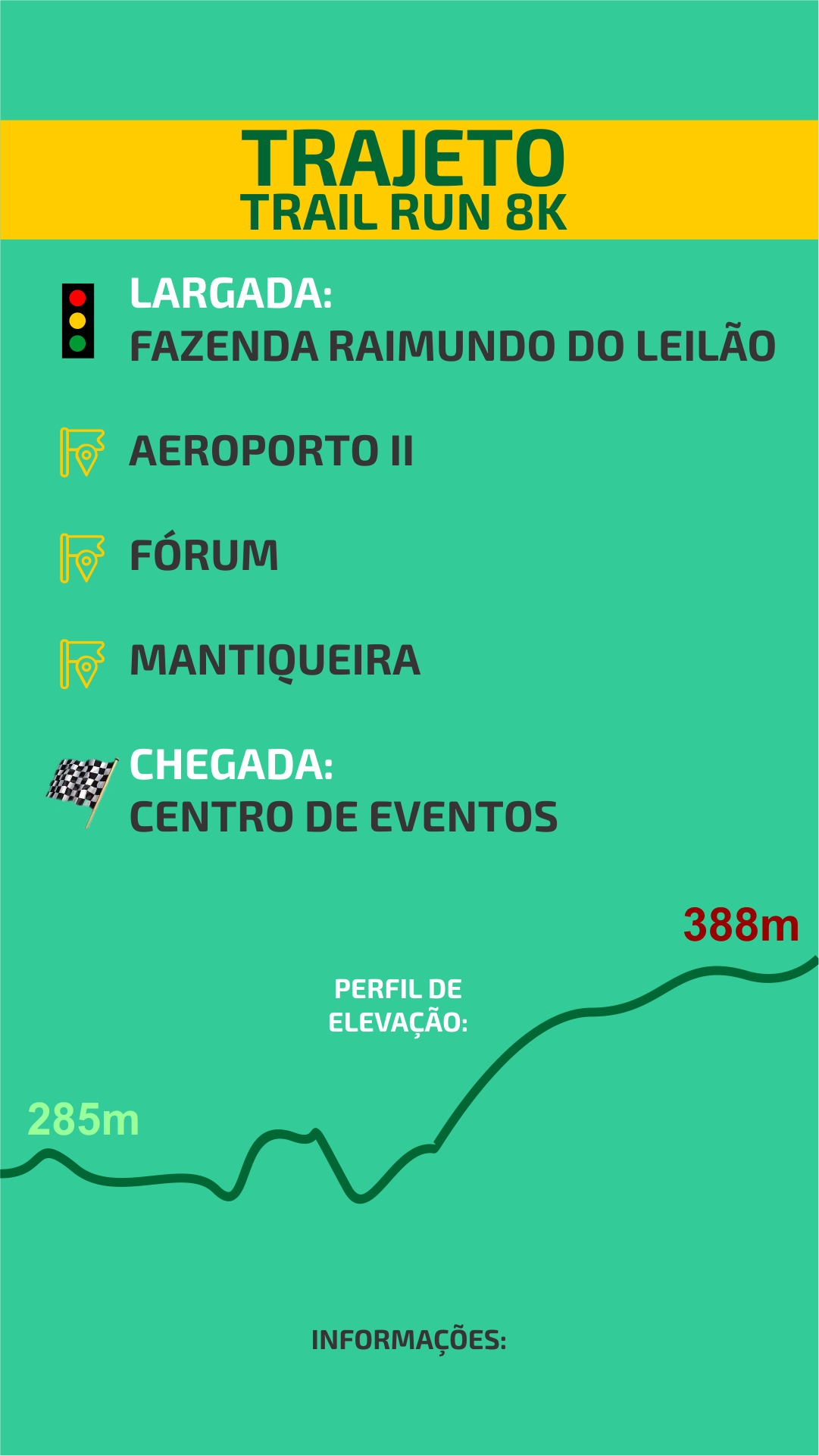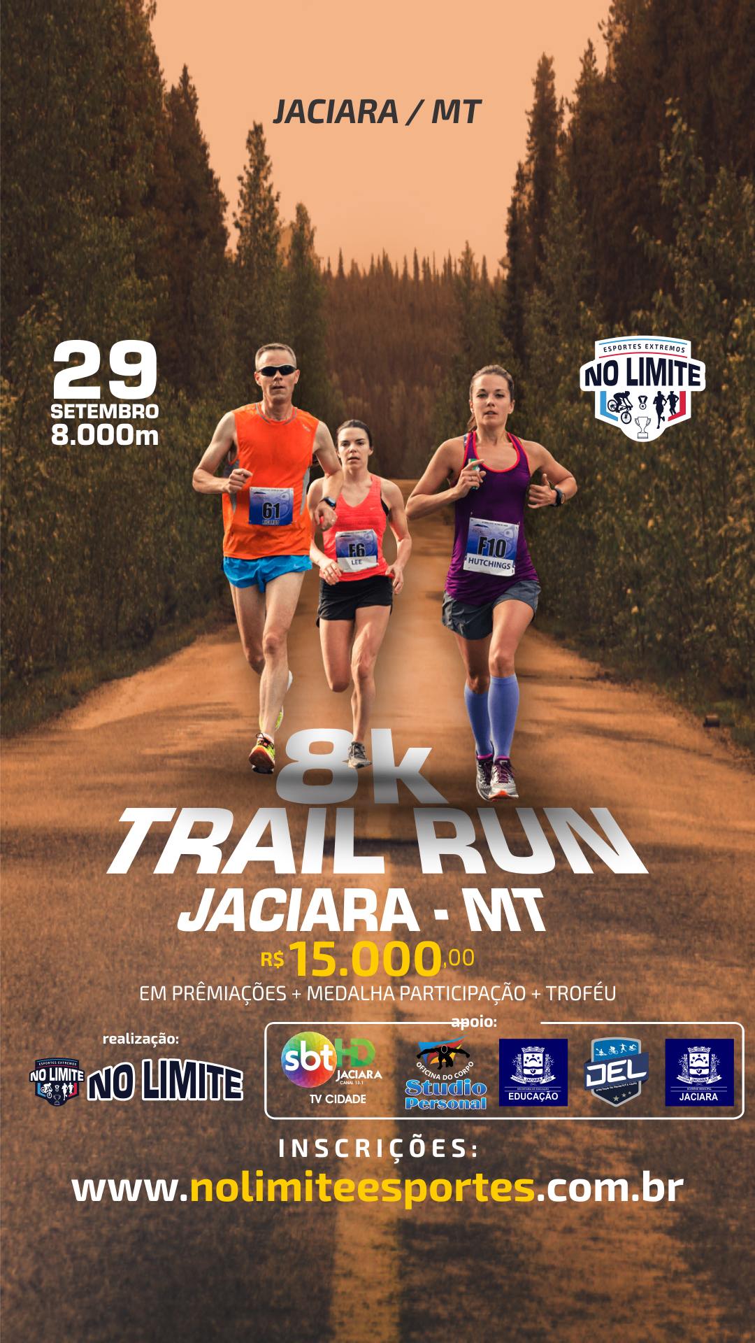 A prova de TRAIL RUN 8K será realizada no dia 29 de Setembro de 2019, domingo, às 7h30m** , e terá distância de 8 km, podendo sofrer alterações para mais ou para menos conforme condições locais. Os atletas deverão estar no local de largada com meia hora de antecedência, devidamente equipados e aptos a participar desta corrida.
