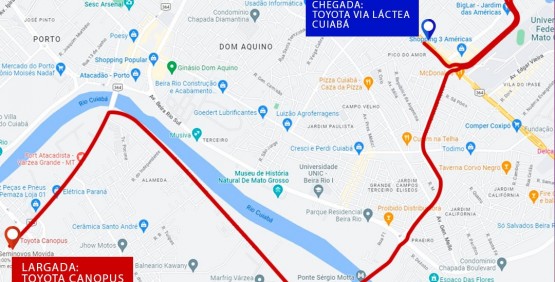 A corrida terá sua largada em frente à Entrada no funil em frente a Orion Toyota Avenida da Feb 1555 – Várzea Grande. A largada será às 06h30, com qualquer condição climática, até 06:45hr, e chegada em frente à Via Toyota, Avenida Fernando Correa da Costa 1800 – Cuiabá/MT – Jardim Kennidy.