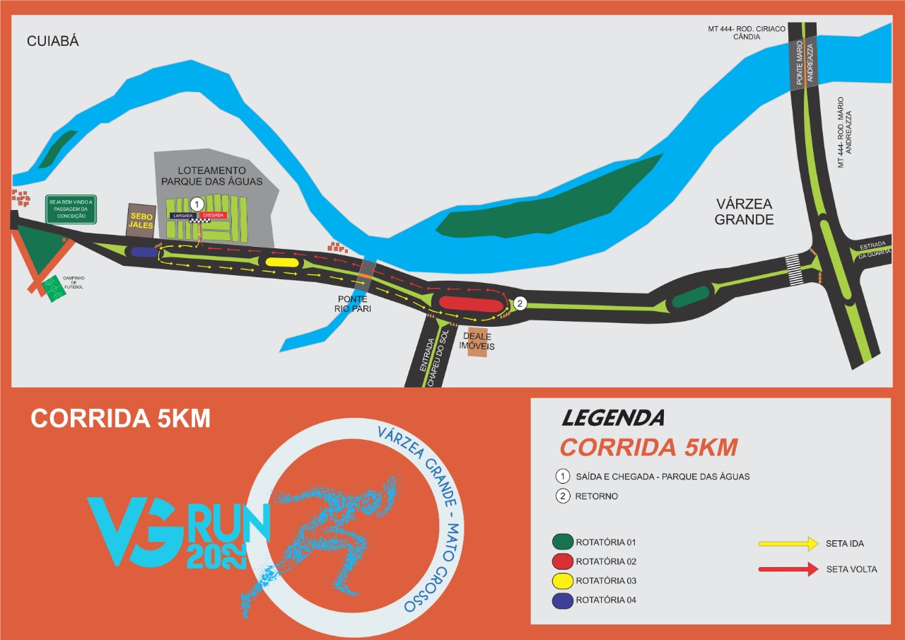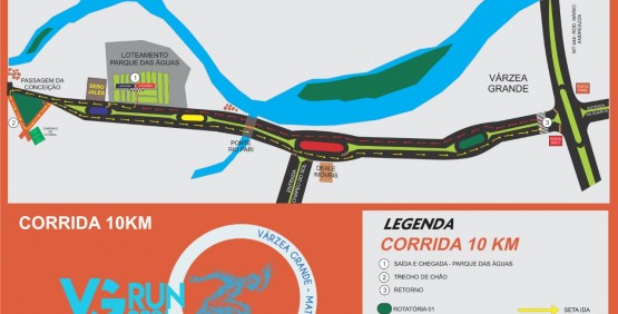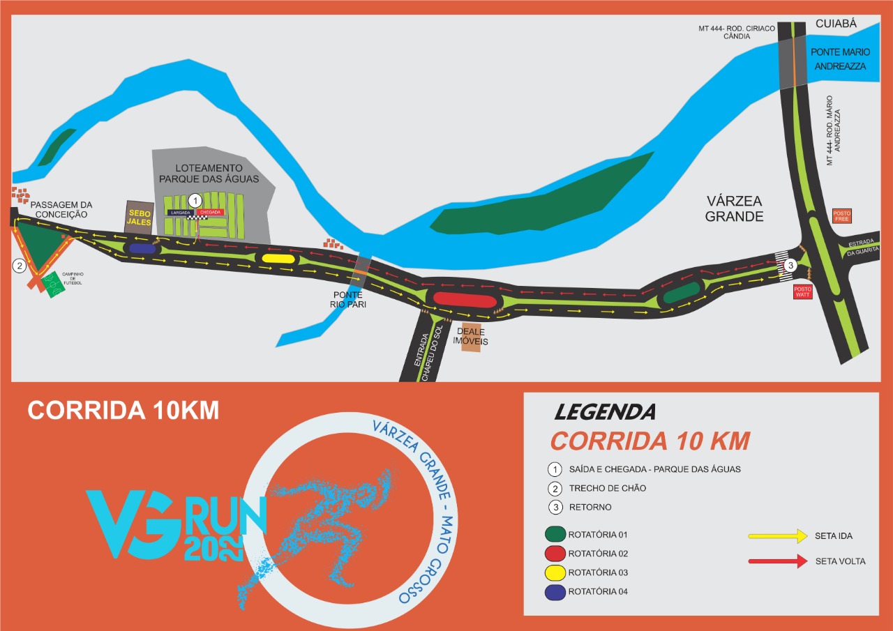A Largada e chegada será no mesmo lugar para os percursos 10km e 5km na quadra 30 do loteamento Parque das Águas, situado na Av. da Passagem da Conceição, homologado pela CBAt (confederação Brasileira de Atletismo) e FAMT (Federação Mato-grossense de Atletismo). Mapa do percurso em anexo.
