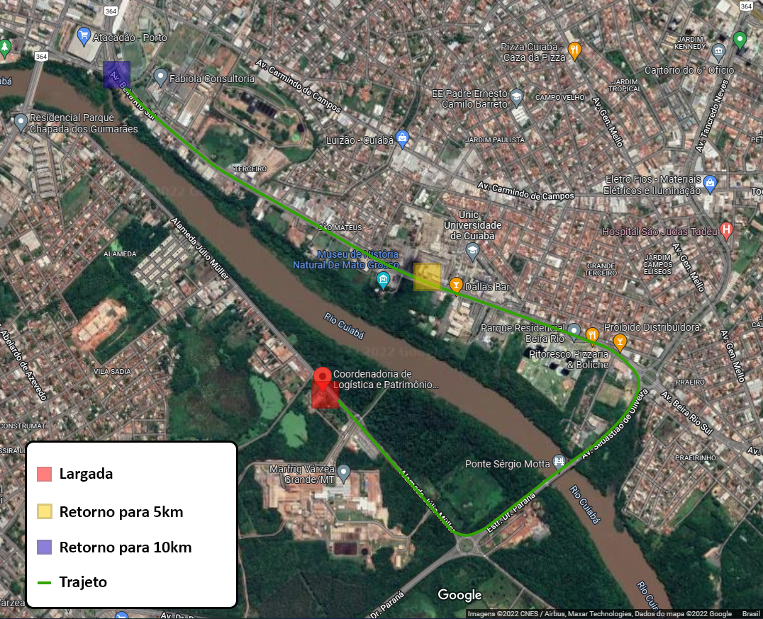 O percurso de 10 quilômetros (anexo I): Largada na Alameda Julio Muller, Diretoria de Administração Institucional do CBMMT, Bairro Alamenda Várzea Grande - MT, segue pela Estrada Dr. Paraná sentido Ponte Sérgio Motta, atravessando para cuiabá pela avenida Sebastião de Oliveira, vira para a Avenida Beira Rio seguindo até as proximidades do Supermercado Atacadão onde se realiza o retorno e pelo mesmo percurso retorna ao ponto de partida.